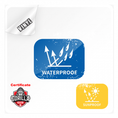 Premium white PP foil with highly permanent Gorilla Glue with 100% UV and Waterproof protection. 8 x more thick than a normal sticker and then covered with an ultra-sticky glue...